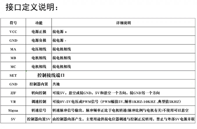 The driver supports forward and reverse switching, potentiometer speed regulation. Potentiometers can generally be used for 10-50K, or PWM 5V signal speed regulation can be used. The specific definition can be seen in the introduction diagram. The positive and negative poles of the driver input power supply must not be connected incorrectly, and the output UVW three-phase should not be short circuited, otherwise it will burn the driver. The driver comes with 18mm thick heat dissipation fins, and high-power use depends on the actual heat generation. If the heat generation is large, a fan should be added for forced air cooling.