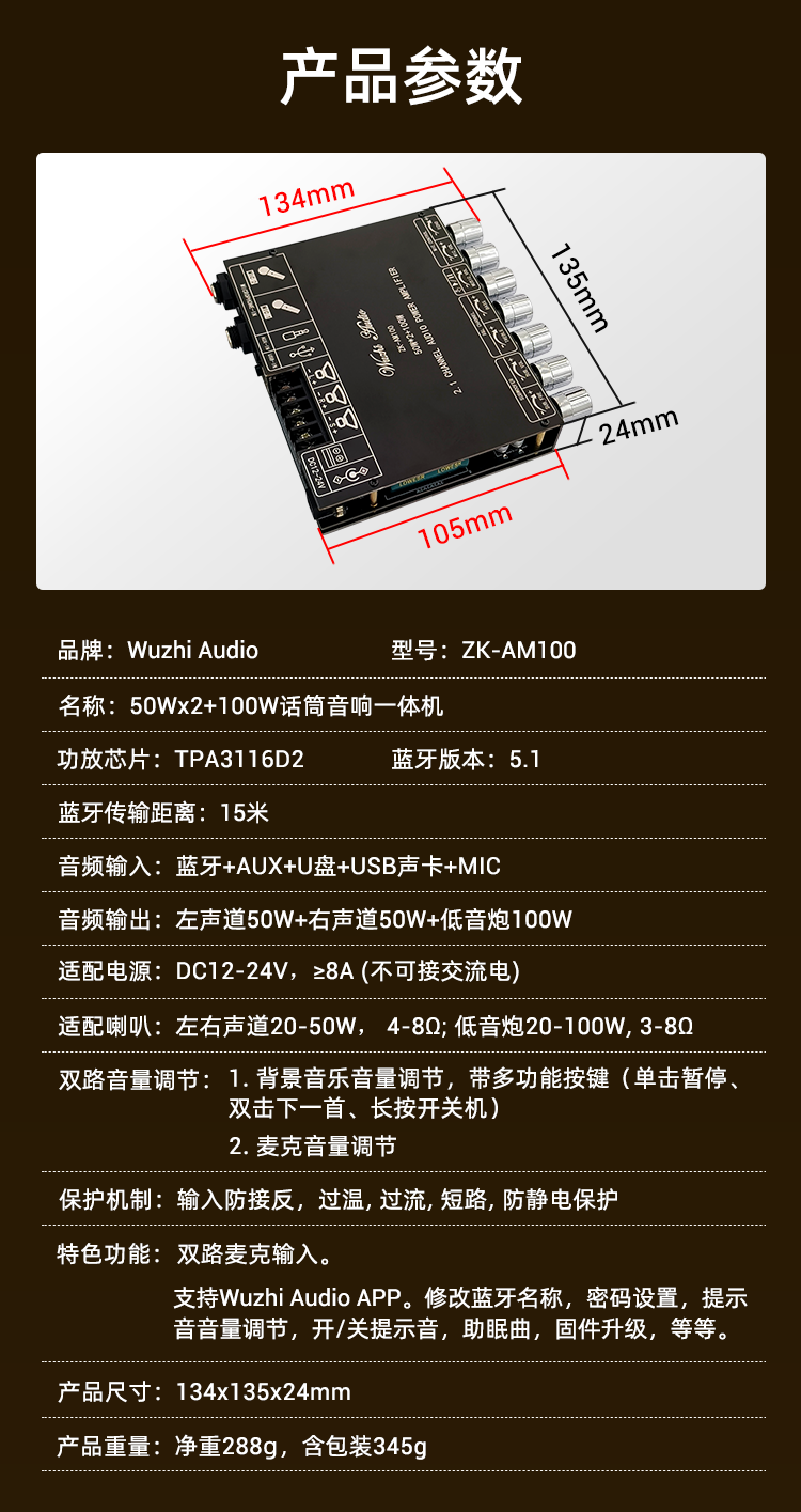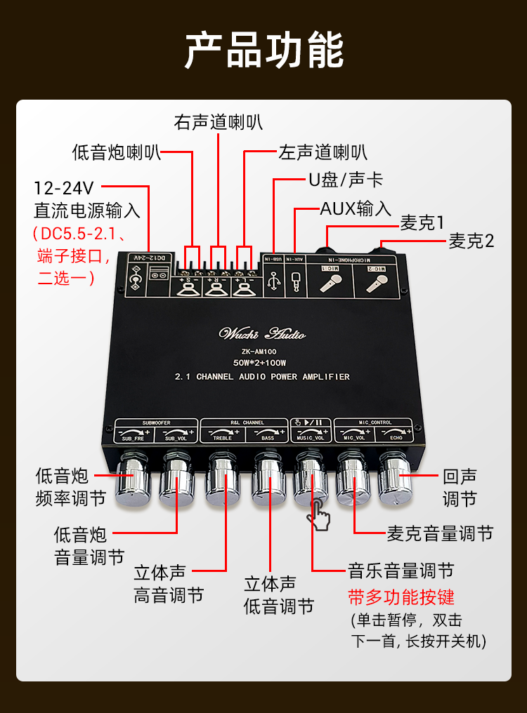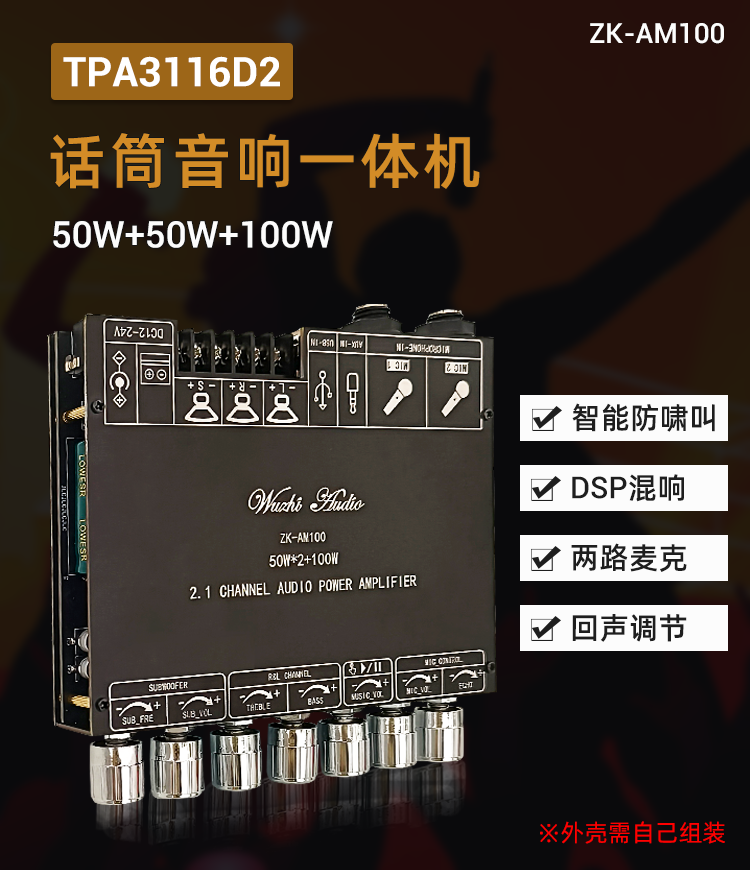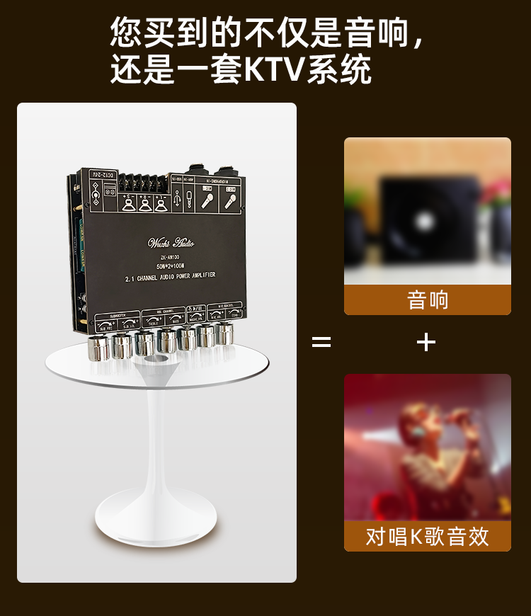 ZK-AM100 High Power KTV Microphone Audio All-in-One 2.1 Channel Bluetooth Power Amplifier 50+50+100W