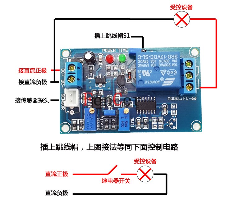 3. Delay adjustment method:The time range for inserting jumper S2 is 1-20 seconds, and for unplugging it is 1-200 seconds. The delay potentiometer can be adjusted clockwise for a longer time and counterclockwise for a shorter time. When adjusting sensitivity, be sure to set the delay to about 1 second (counterclockwise for about 10 turns);