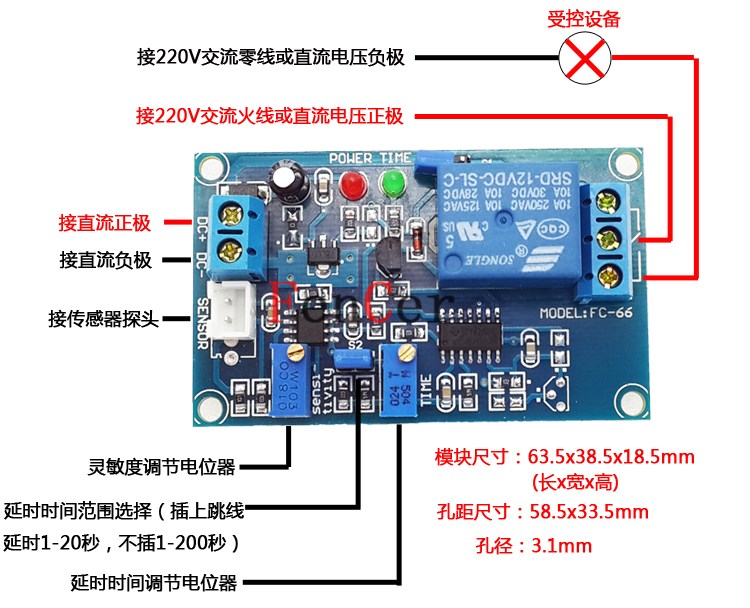 3. The product is equipped with an adjustable potentiometer to adjust sensitivity and delay time;