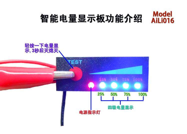 oneConnect the positive and negative terminals of the display board to the positive and negative terminals of the tested battery,Gently press the red button with your fingers, IEDThe light is onDisplay real-time battery level