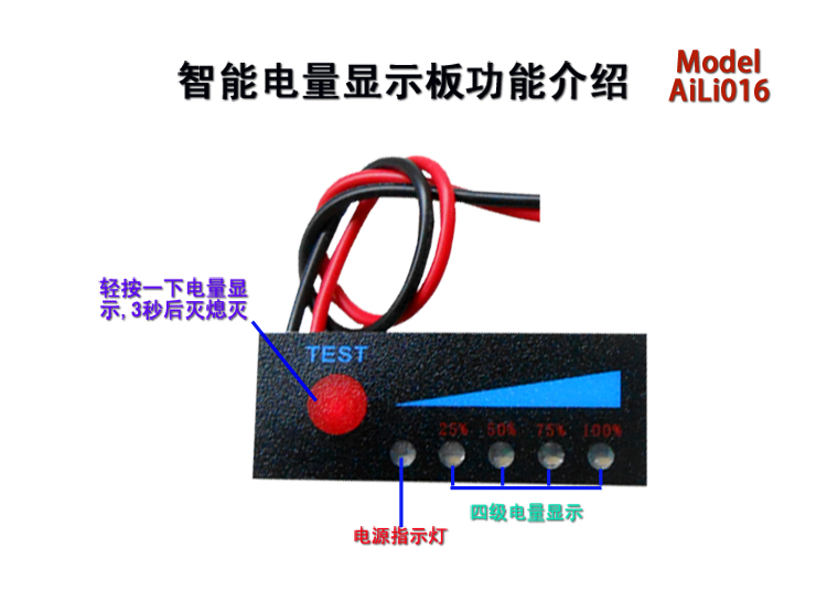 Warm sound prompt: 3.7V lithium battery is used1 red onePower indicator light,4 green onesPower indicator light, for other voltage ranges1 red onePower indicator light,4 green onesPower Indicator Light
